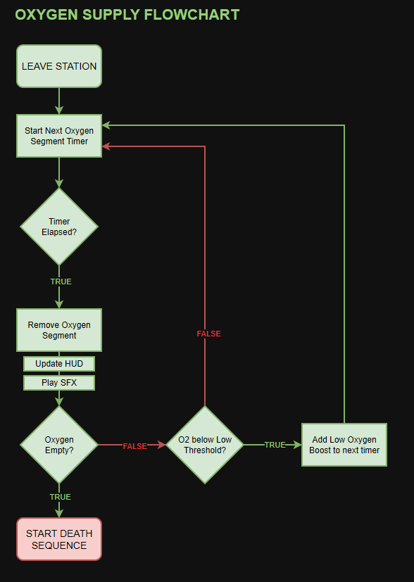 The oxygen system is vital in supporting the core tension and enabling progression, as it limits how much time the player can spend exploring per trip out of the station, giving consequence to using lower power levels and therefore lower speeds.