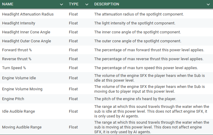 When the player changes the power level they will see the UI update (see section 3) and hear SFX (see section 4). The power level's data set will be loaded and used by the sub affecting engine noise, sub movement and headlight settings (see section 2.5).