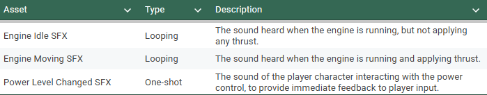 SFX will be required to represent the engine's current noise level and to provide feedback when the player changes thier power level.